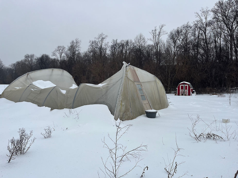 -Yes, the greenhouse was destroyed by the ice and sleet. NOT good news, I know, BUT we have been able to save all of the greenhouse film and we will be able to reuse it! Our old greenhouse was called a high-tunnel. It was about 14 feet tall. We have made the decision to build low-tunnels instead of rebuilding the high-tunnel. The low tunnels will be about 3 feet tall. We will still be able to grow cold-weather crops such as kale, broccoli, lettuce, and spinach throughout the winter. It is unfortunate that we lost the high-tunnel- we lost all of the crops which were growing inside. The good news is that the ducks and chickens were thrilled to be able to eat what remained. As soon as the snow clears, we will build the low-tunnels and try to get a good headstart for spring.